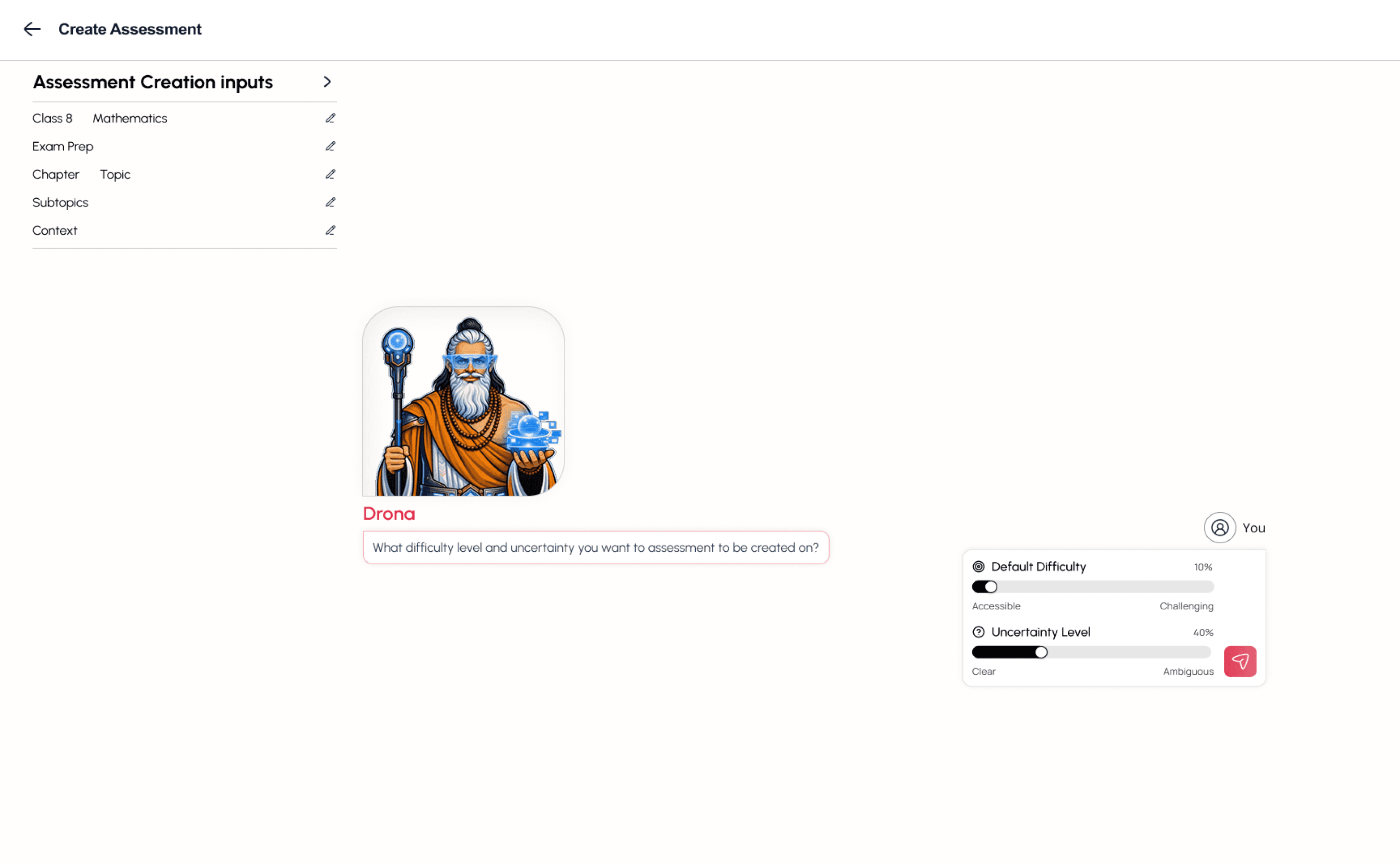Teachers input topic, scope, and difficulty to initiate assessment generation.