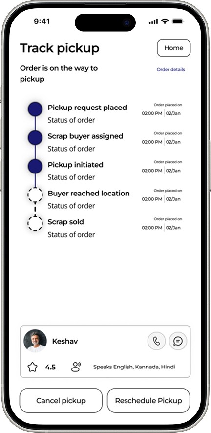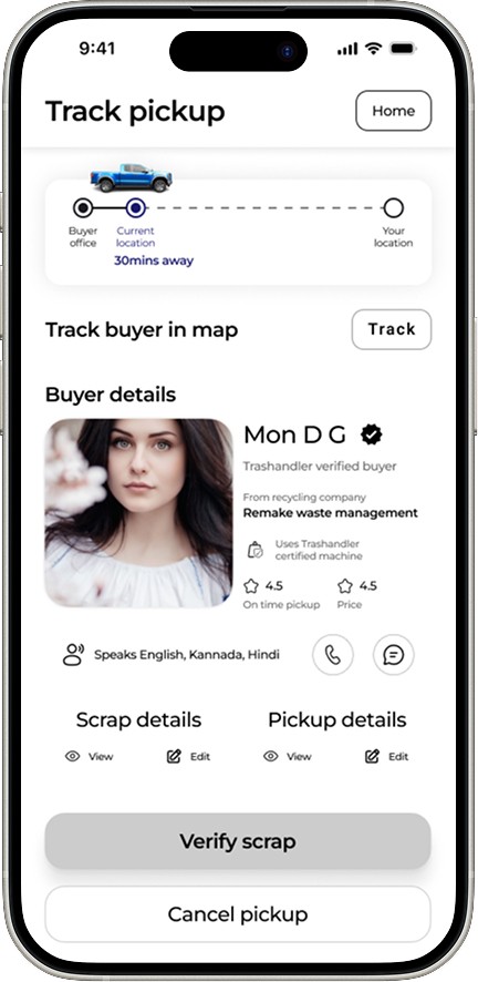 ✅ Gave users direct access to edit pickup details and introduced a clear CTA (“Verify Scrap”) that activates when vendor arrives.